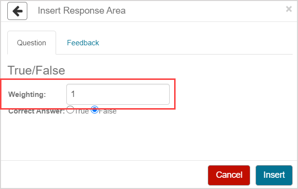 TIP: The weight of the component can be any integer greater than 0, and is calculated proportionate to the total of all weights across the question. Example — A question with two components could have the first weighted as 2, and the second weighted as 4. This means that the second component will be worth twice as much as the first when calculating the total grade for the question.