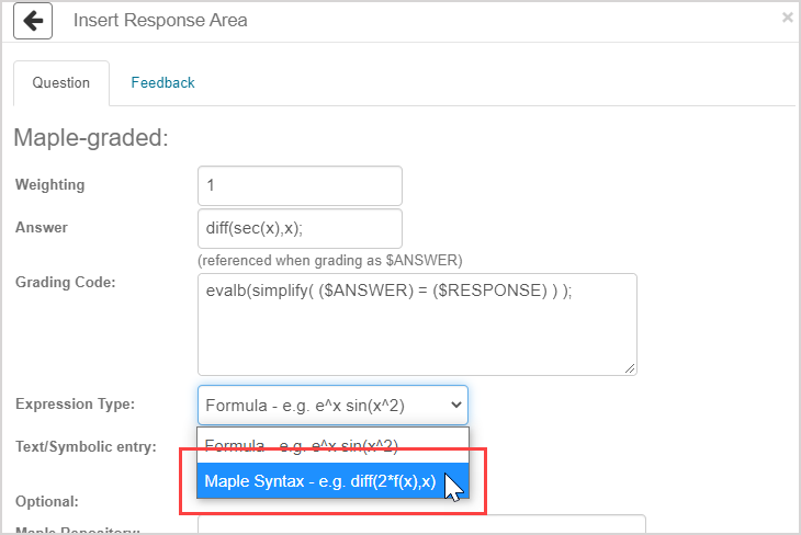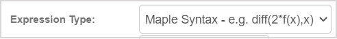 IMPORTANT: This sub-type allows the student to enter Maple commands as their response to a question (Example — diff(sec(x),x);), so be cautious when authoring your correct answer.