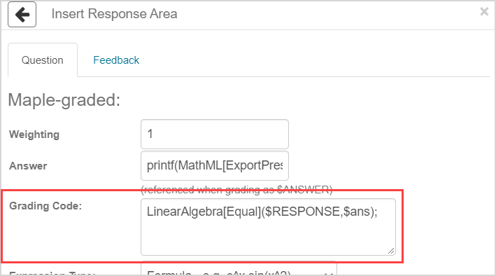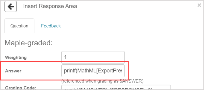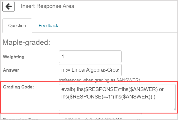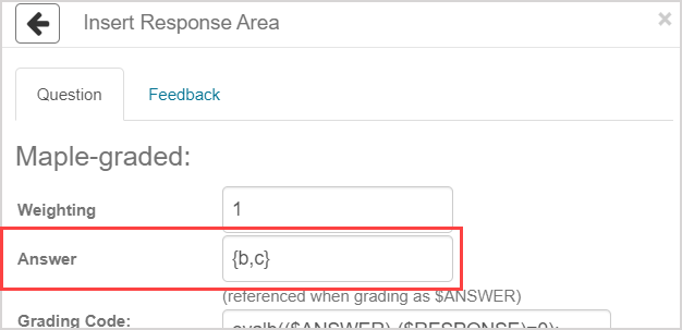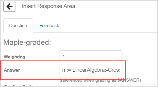 TIP: Check out View example Maple grading code for help with authoring custom grading code for your Maple-graded questions.