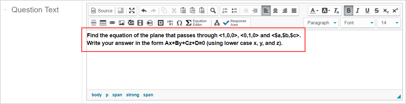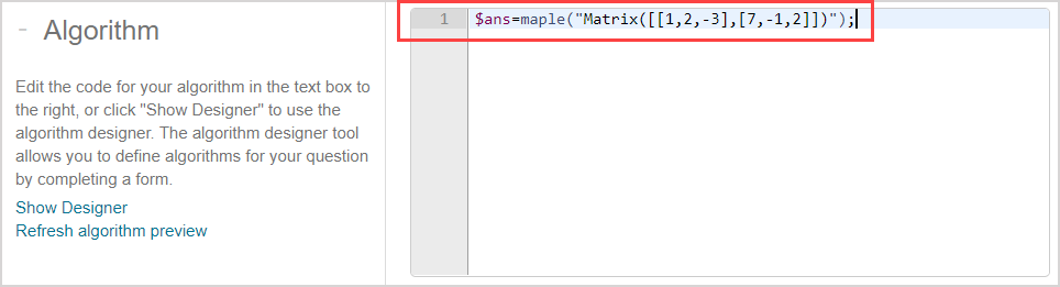 NOTE: The $ans variable that you've defined in the algorithm must be used for grading the student. The $ANSWER variable that contains the MathML expression from the Answer field isn't used for grading the student.