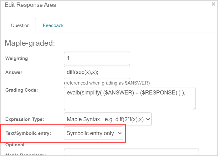 - Student responses are parsed into proper Maple syntax when the question is configured with symbolic entry mode.