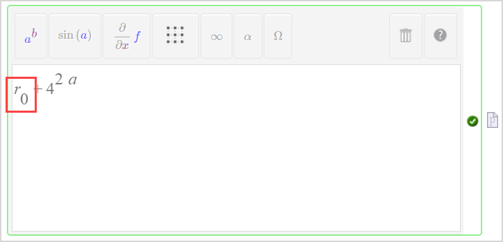 Use square brackets (x[n]) (Example — r[0]) to denote subscript in the Answer and Grading Code fields during authoring.