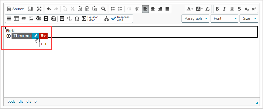 ![]() | Add Block | N/A | Inserts a block element. TIP: Hover your cursor over the inserted block and click Edit to modify the block element.