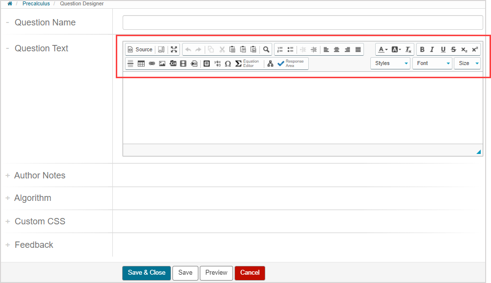 ![]() | Insert/Edit Adaptive Section | N/A | Displays the Adaptive Section window and inserts an adaptive question section in the text entry field. Adaptive, multi-part questions can be designed where one sub-question (or section) is presented at a time and the question behavior depends on whether the student answers the sub-question correctly. TIP: Check out for Author an adaptive question for some extra tips on how to use this operation. |
