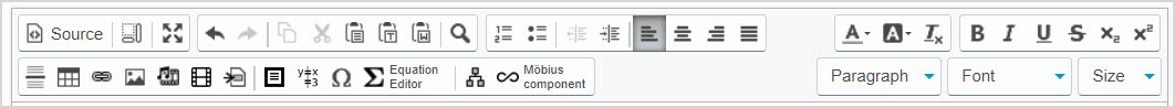 ![]() | Möbius component | N/A | Displays the Insert Möbius component menu where the type of component is defined. Adding a student response component qualifies the content item as a question. TIP: Check out View available question types to view the different types of Möbius components. |