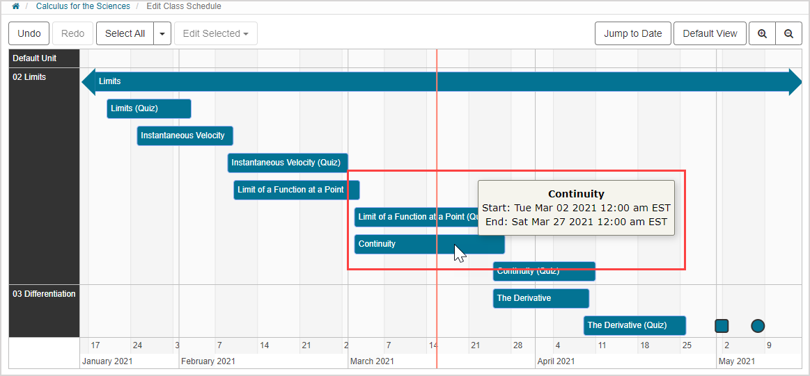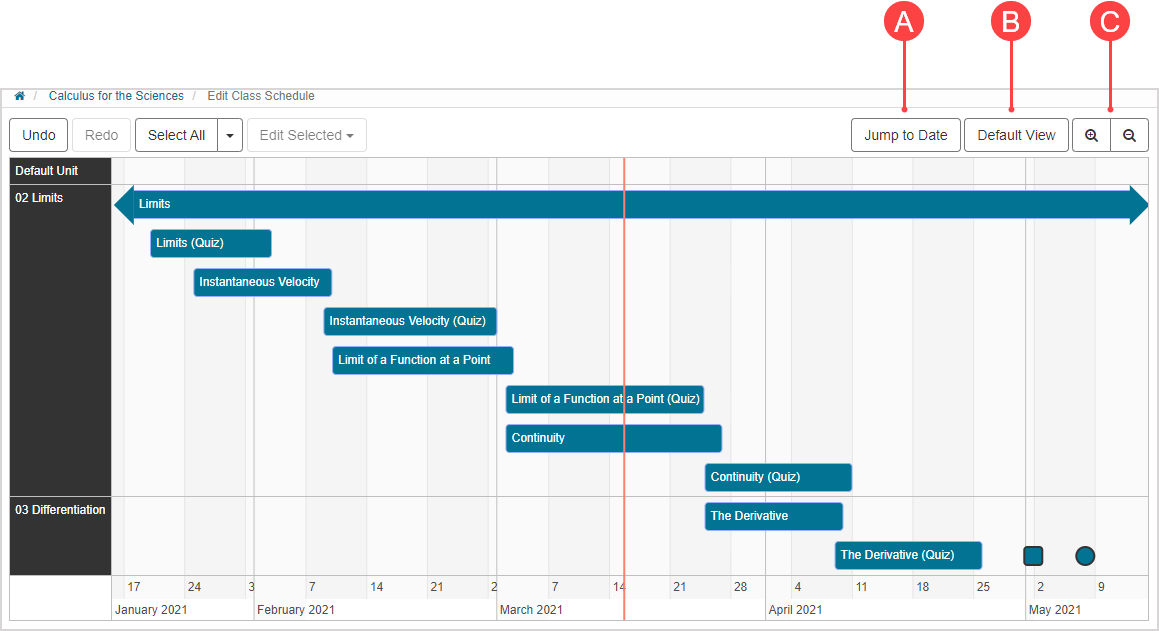 NOTE: The vertical line representing the current date won't be visible if you click Default View and your default view date range doesn't include the current date. Check out Work with the Class Schedule default view. Example — If the current date is April 15th and your default view is January 6th through April 6th, clicking Default View will display your default view but the current date vertical line will not be visible.