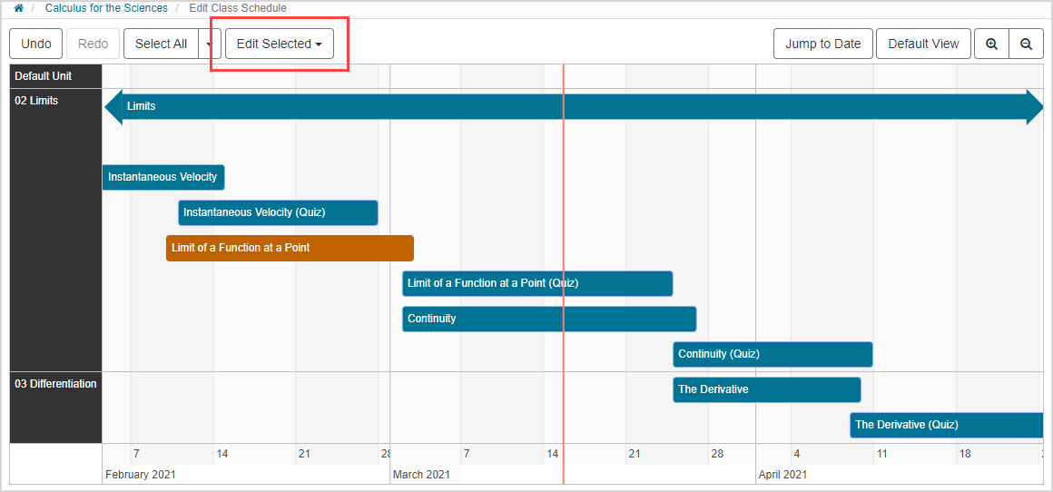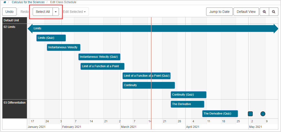 After selecting a set of items on the Class Schedule, you can use the Edit Selected drop-down list and select Move Dates: