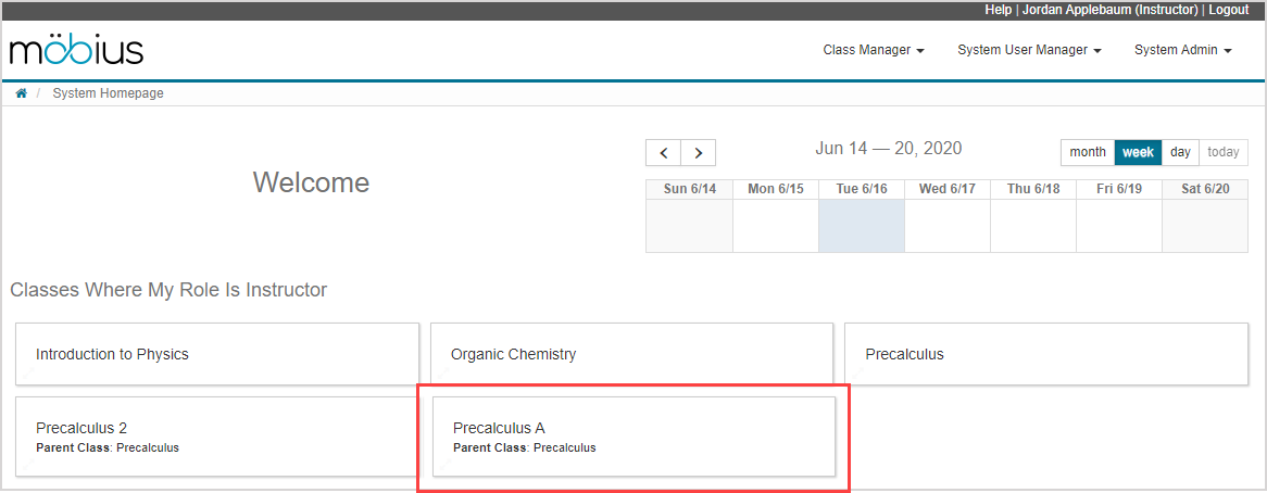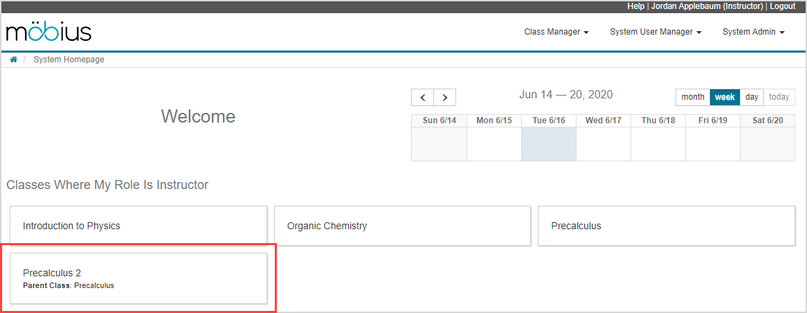 After completing the instructions for Create a class, your new child class is created and listed on your System Homepage. The featured class that was selected is displayed as the parent class alongside the name of your new child class.