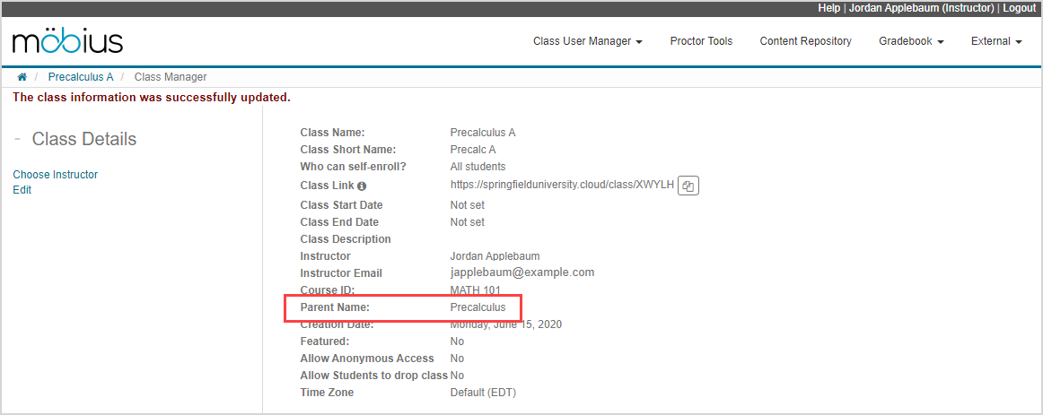 After completing the instructions for Create a class, your new child class is created and the selected featured class is listed as the parent class in the Parent Name field of the Class Details summary page.