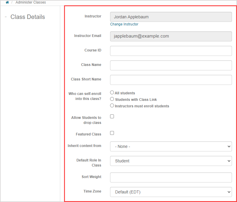 | Instructor | Instructor assigned to the class is the instructor user profile being used to create the class. This is the primary instructor of the class and is the instructor that's listed on the Class Homepage. Click Change Instructor to assign a different user as the primary instructor (check out Change the primary instructor).