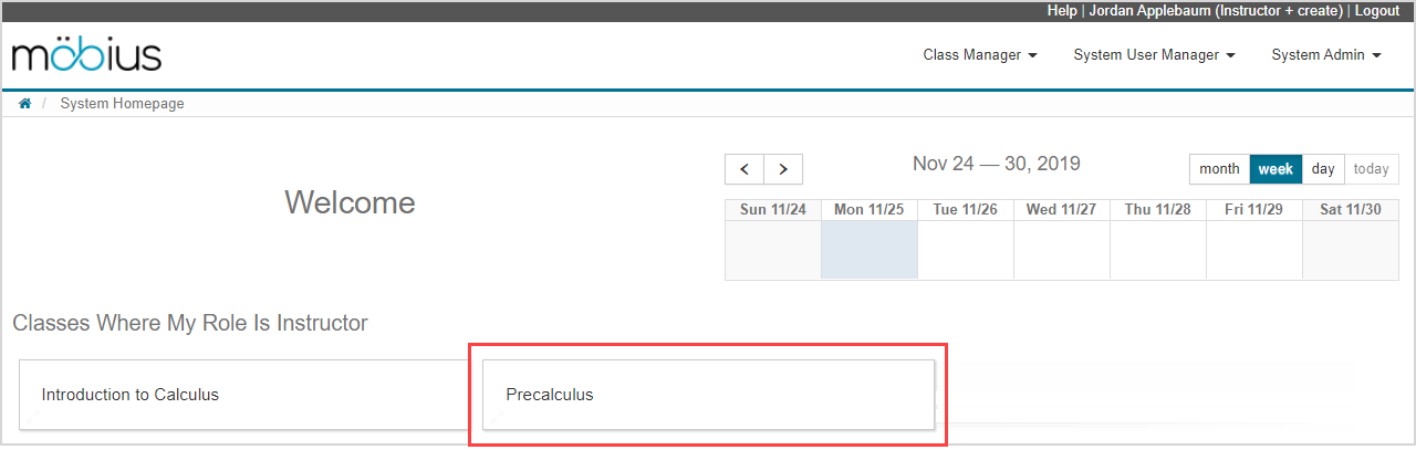 Your new class now appears on the System Homepage in the class list of Classes Where My Role Is Instructor.