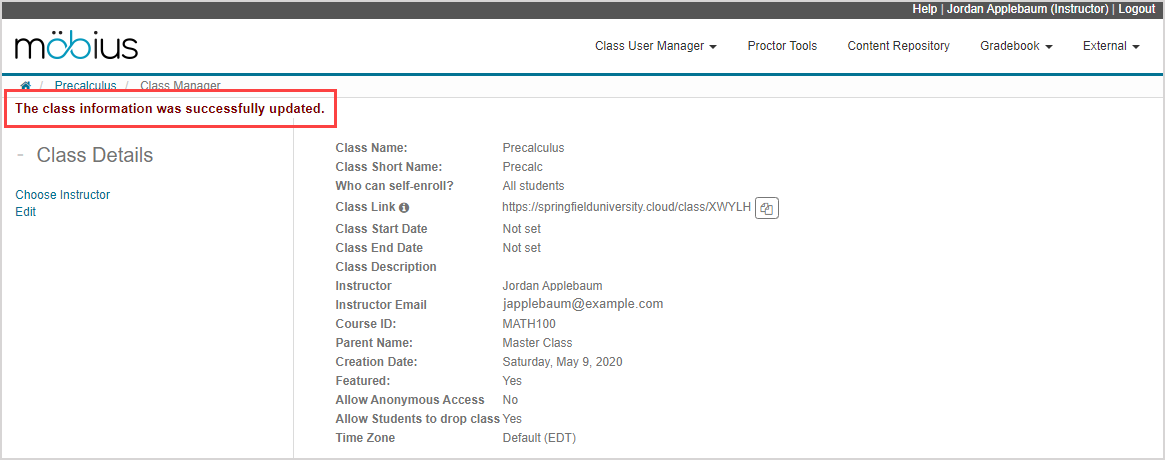 A success message appears after your class has been created. You can also review the details of your new class.