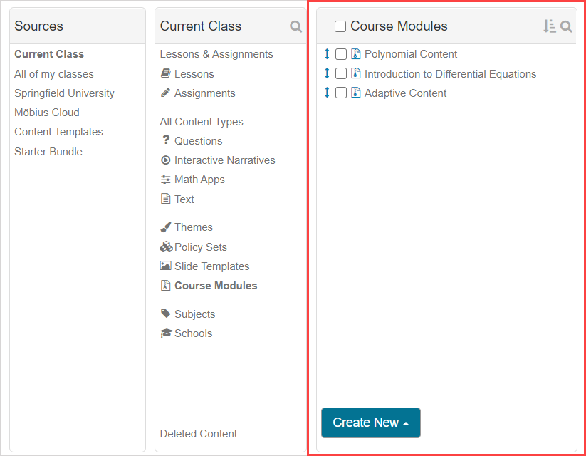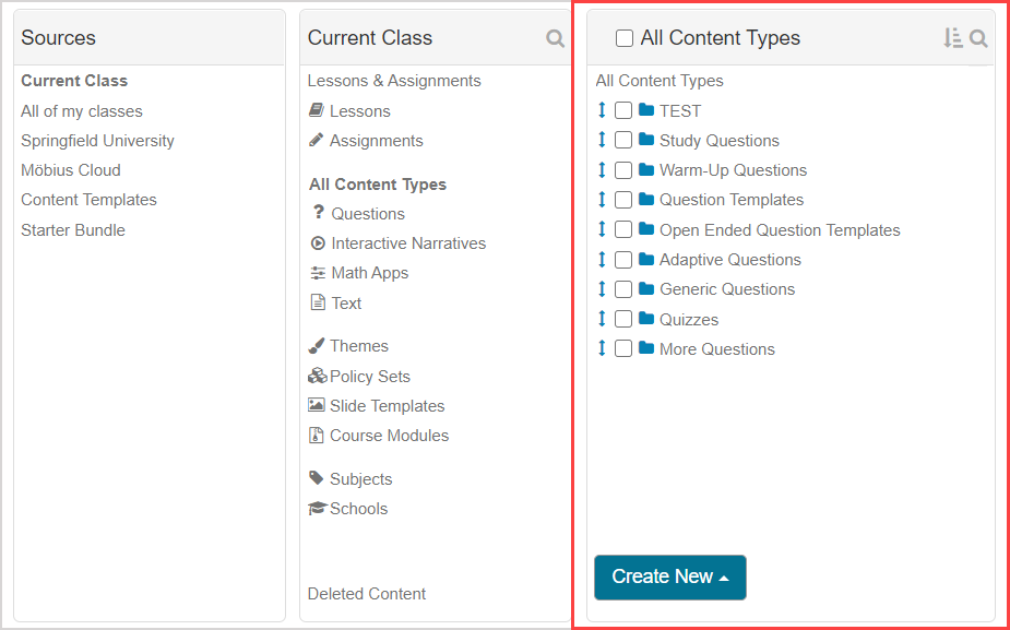 Content — Any component relating to the subject matter of a class (Example — Questions, Text, Lessons, Assignments, Interactive Narratives, Units, etc.).