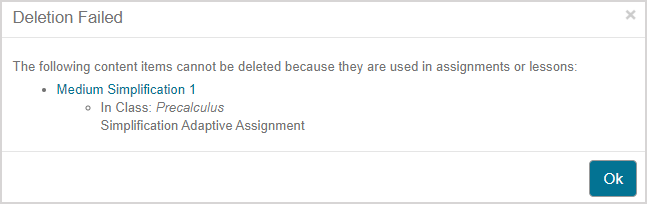 NOTE: Clicking to delete a question, interactive narrative, Math App, or text that's in use by an activity will display an error stating that the selected content is in use.