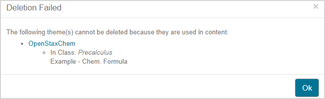 NOTE: Clicking to delete a theme, Policy Set, or slide template that's in use by another piece of content will display an error stating that the selected content is in use.