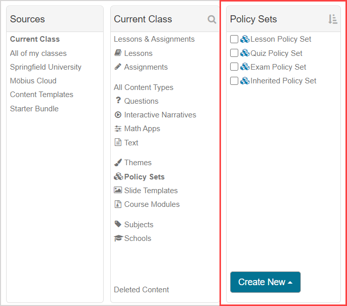 NOTE: Content and supplementary content can't be deleted if it's in use. The content or supplementary content must first be removed from use within an activity in order to be deleted. Example — Policy Set A can't be deleted if it's applied to an assignment. Applying a different Policy Set (Policy Set B) to the assignment allows Policy Set A to be deleted.
