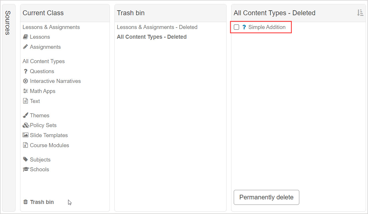 - Permanently delete questions, interactive narratives, Math Apps, and text (check out Permanently delete content)