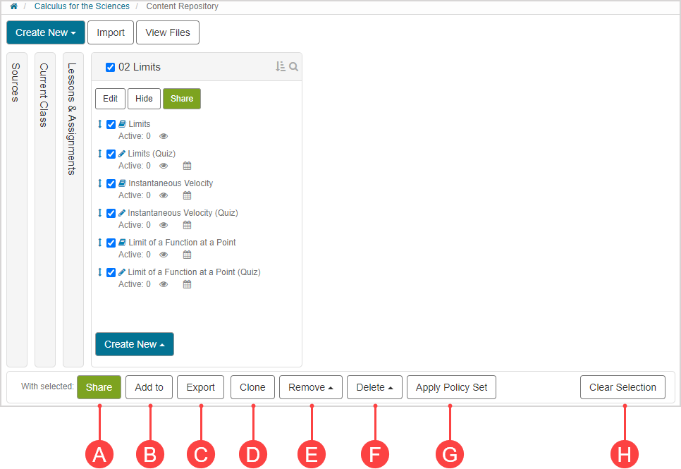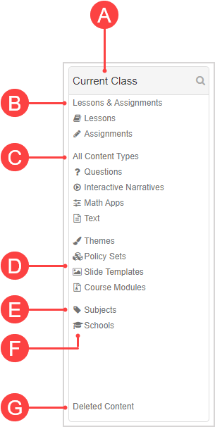 NOTE: (G) Deleted Content is a folder that only appears with Current Class as the selected source. The Deleted Content folder will only contain individual pieces of content that have been deleted: