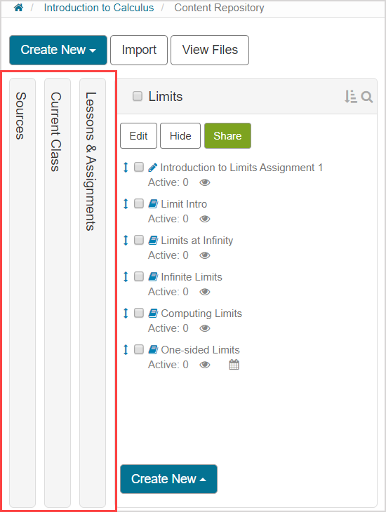 ![]() | Visible content — Content that is displayed to students on the Class Homepage and Calendars. |
