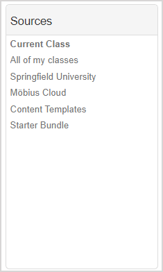 NOTE: If Möbius Foundations is available as a content source within your organization, it will reveal a different layout when selected as a source. Check out Explore Möbius Foundations.