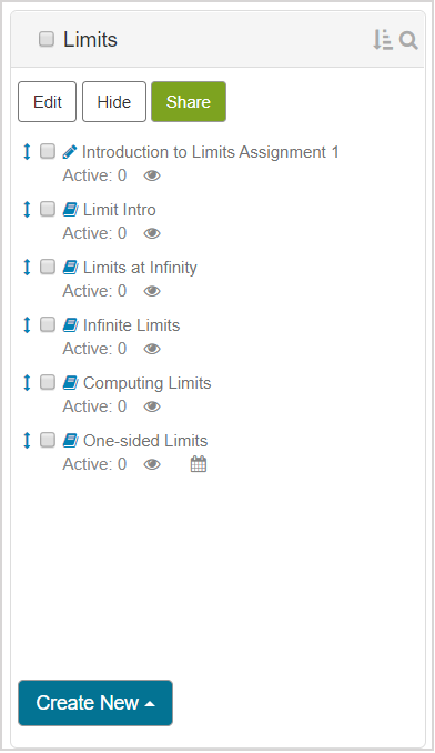 | Hidden content — Content that is not displayed to students on the Class Homepage and Calendar. | |