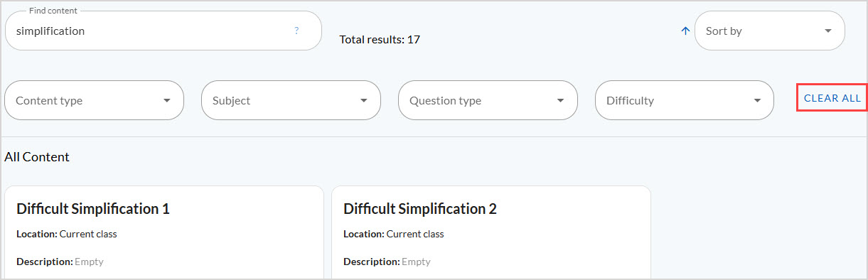 (Optional) Click Content type, Label, Question type, Subject, or Difficulty to open filters which can help refine your search results.