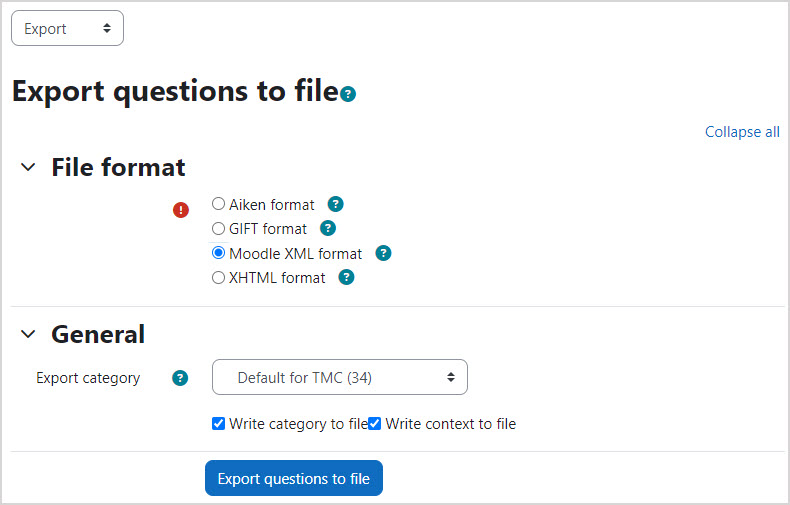 • Ensure the file has been exported with the methods listed above, and the file is in the QTI or Moodle XML file format.