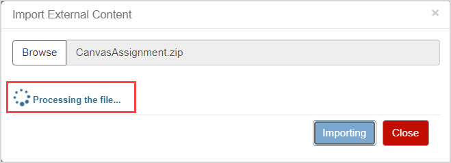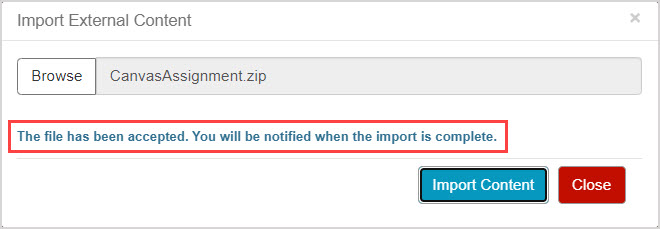 1. A success message appears that the file has been accepted for processing by the Assignment Importer. You will be notified by email when the conversion and import has been completed.