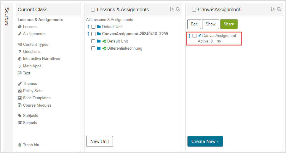 The imported assignment is listed under Lessons & Assignments, inside its own unit named CanvasAssignment.