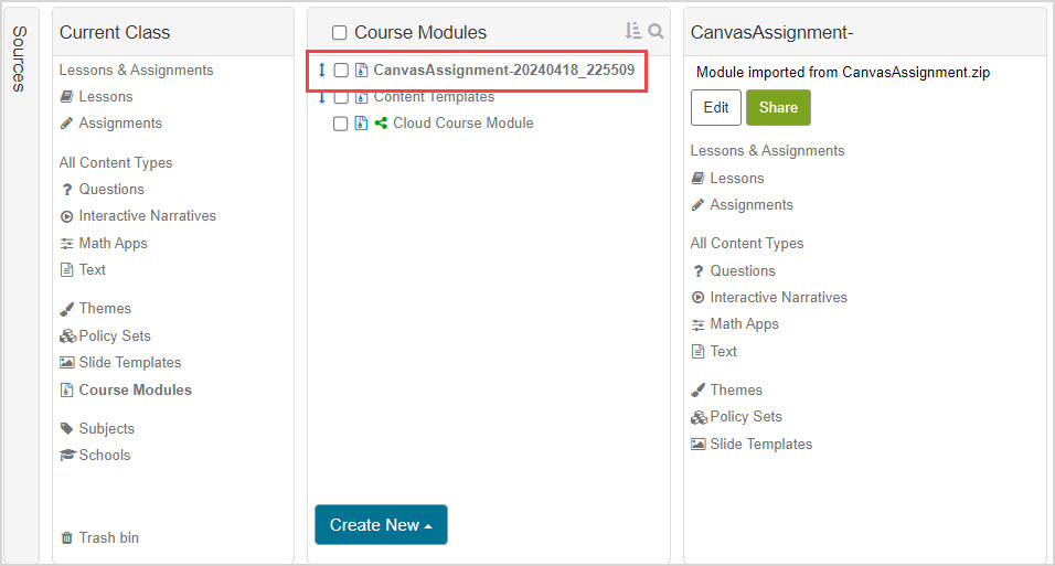 In the Content Repository under Course Modules, there is a new Course Module with the name CanvasAssignment.