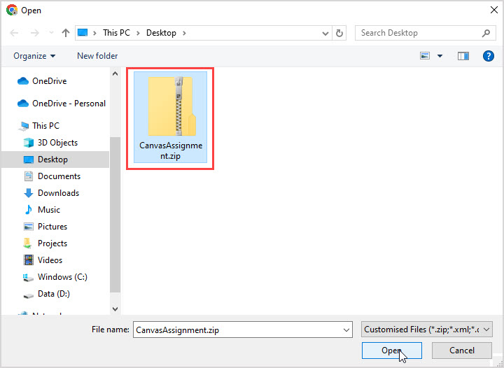 The zip file called CanvasAssignment on the device desktop is highlighted.