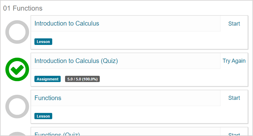 Green circle with a green check mark to indicate that an activity is completed.Completed — You've passed the activity or your attempt is awaiting manual grading.