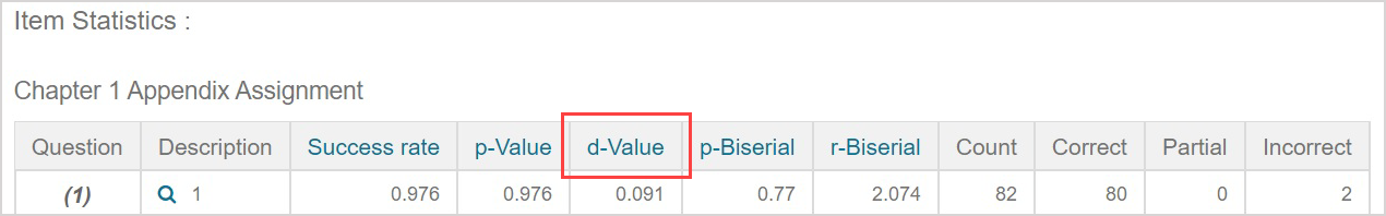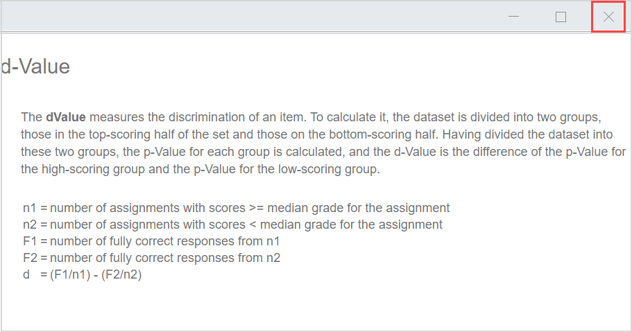 | d-Value (discrimination value) | The difference in p-Value between two groups: those attempts that scored above the median on the full activity, and those that scored below the median.