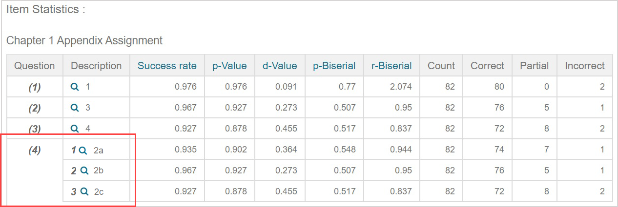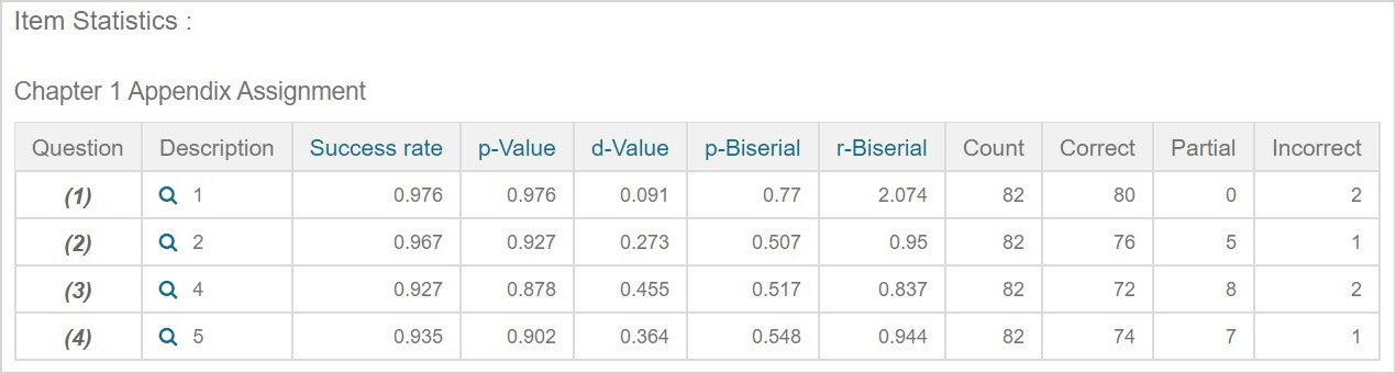 | p-Biserial (point-biserial correlation coefficient) | A correlation coefficient relating performance on a question with dichotomized grades, to performance on the full activity. Measures the extent to which students who score high on the activity tend to get the question correct and those who score low tend to get the question incorrect.