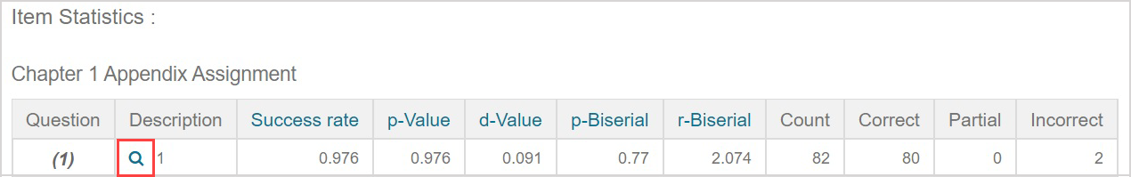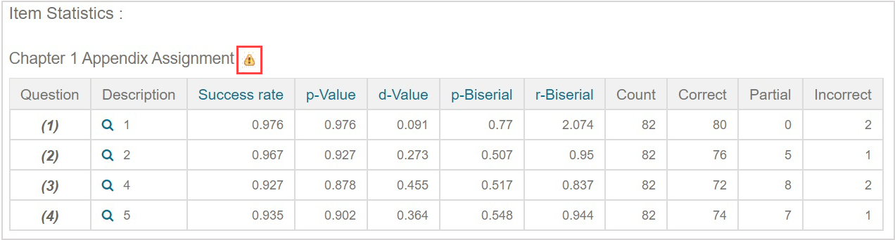 NOTE: If you edited the activity after students have started their attempts, this can affect the accuracy of the item statistics results and you should interpret the results with caution. This interference is indicated with the caution icon