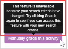 TIP: Changing your search criteria on this page will prevent you from being able to click Manually grade this activity and you won't be able to access the Grade Manager's Activity Grading View. Hovering your cursor over the unavailable Manually grade this activity button informs you that your search criteria have changed and that you should click Search again to ensure that the grade results that you'll be viewing will reflect your most recent search selections.