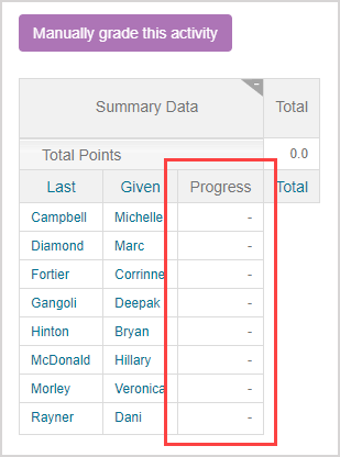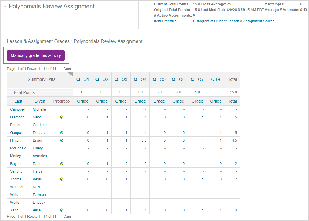 NOTE: Lessons, mastery assignments, and adaptive assignments can't be viewed using the Grade Manager's Activity Grading View.