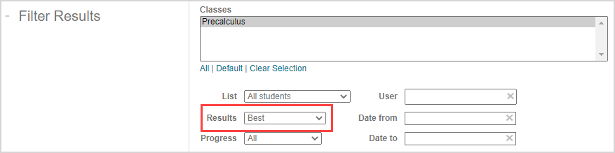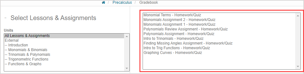 Perform a Gradebook search as you normally would by selecting the activity or activities that you want to investigate from the activity list in the Select Lessons & Assignments pane. Check out Search for class grades for more details on performing Gradebook searches.