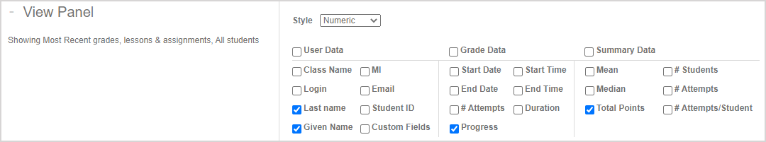 NOTE: The data from your View Panel selections (grade presentation style drop-down selection and User Data, Grade Data, and Summary Data check box selections) of your initial Gradebook search aren't considered once you enter the Grade Manager. The Grade Manager has its own structure for the data that's displayed.