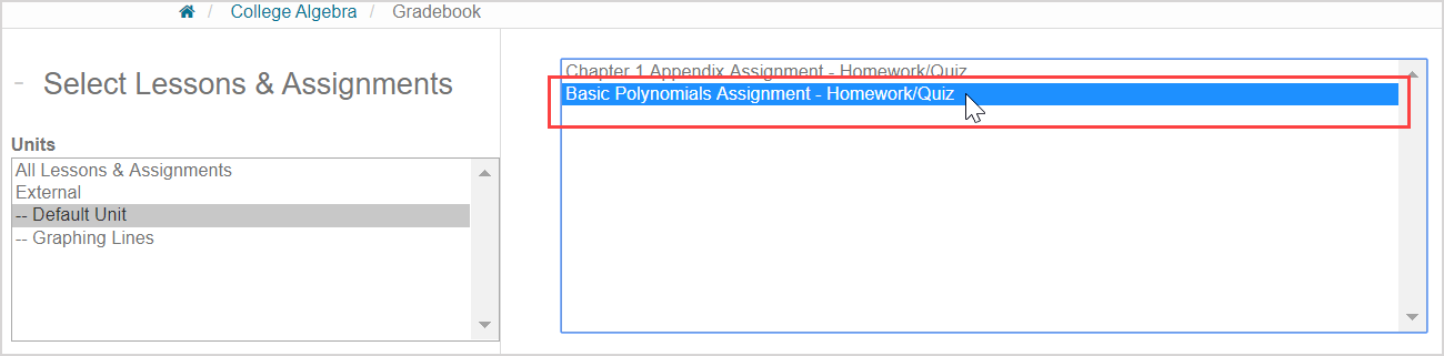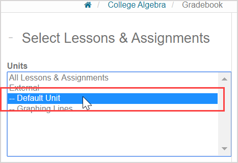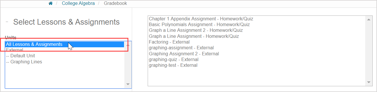 TIP: Select All Lessons & Assignments to display all of your class's activities in the list of available activities.