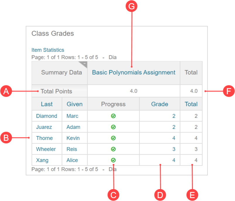 A.Total Points — Default statistical summary data that displays the maximum achievable grade for each activity included in the search.