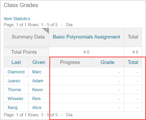 NOTE: If a student's grade is represented with a dash, it means that they don't have an attempt that satisfies your search criteria and you won't be able to view their grade details (Example — if you selected the progress status of In Progress during your Gradebook search, but a student has either already submitted their attempt or has not yet started it, they won't have a result displayed in the results table).