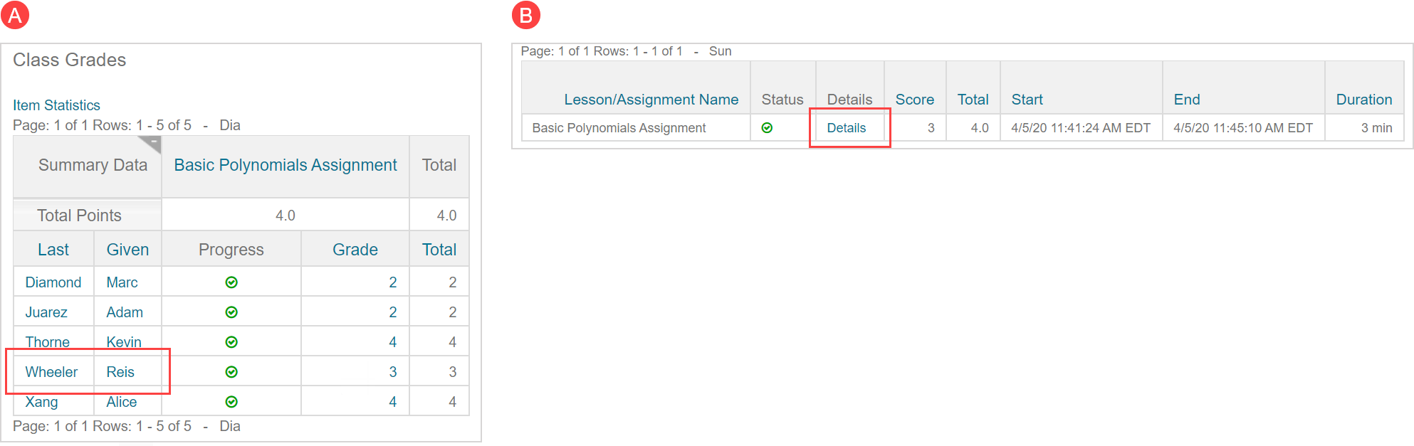 - Or, click on a student's (A) user data value (Example — given name) and then (B) Details: