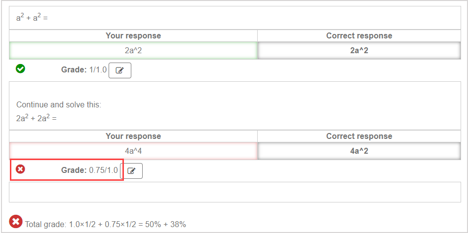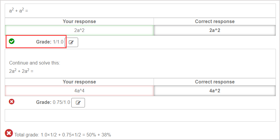 F.Total grade — The overall grade calculation for the entire question that incorporates all of the grades from B and E.