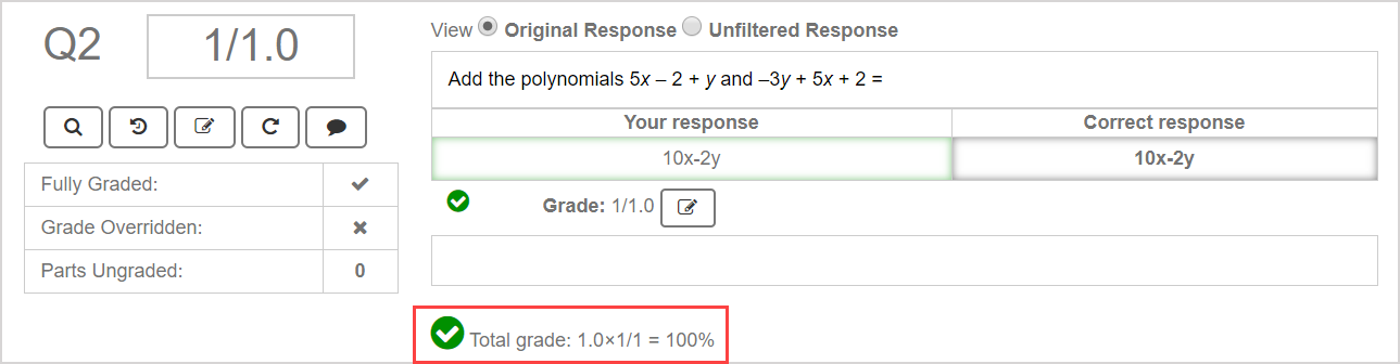 TIP: Manual grading is performed on essay, document upload, and Math App (if designed to be manually graded) questions using the Question pane. Check out Perform manual grading for help with the manual grading icons and controls when performing this type of traditional manual grading.