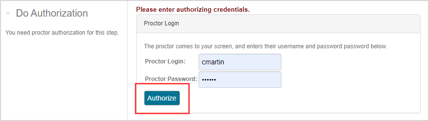 Proctors enter their proctor credentials on the Proctor Authorization Request page to perform local authorization.