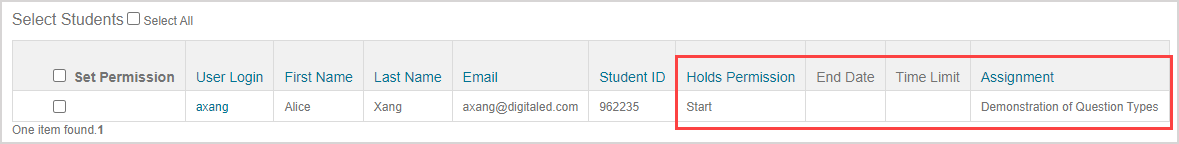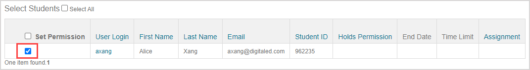The Permissions Table updates to display the selected student with the authorized permissions applied for the selected activity.