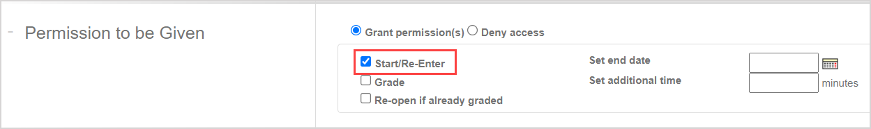 Select the Start/Re-Enter and Grade check boxes with the Grant permission(s) radio button selected.