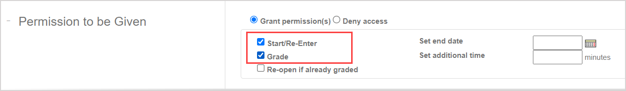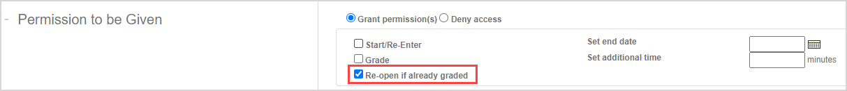Select the Re-open if already graded check box with the Grant permission(s) radio button selected.