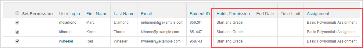 NOTE: An assignment won't be listed for a student in the Permissions Table if the student doesn't hold any permissions for it.